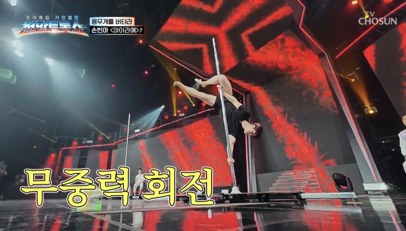 ‘국가대표 매달리는 남자’로 등장한 폴스포츠 기인이 등장해 폴 댄스와는 또 다른 멋진 퍼포먼스를 선보였고, 온 다리에 멍이 든 채 등장한 손빈아는 ‘아이라예’를 부르며 그 동안 갈고 닦았던 실력을 보여줬다.