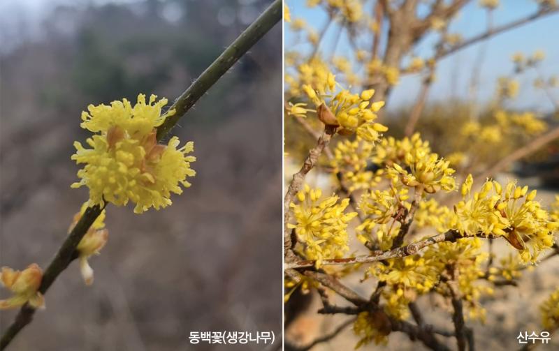 언뜻 보면 산수유처럼 생겼는데 꽃 향을 맡아보면 생강 냄새가 난다.
