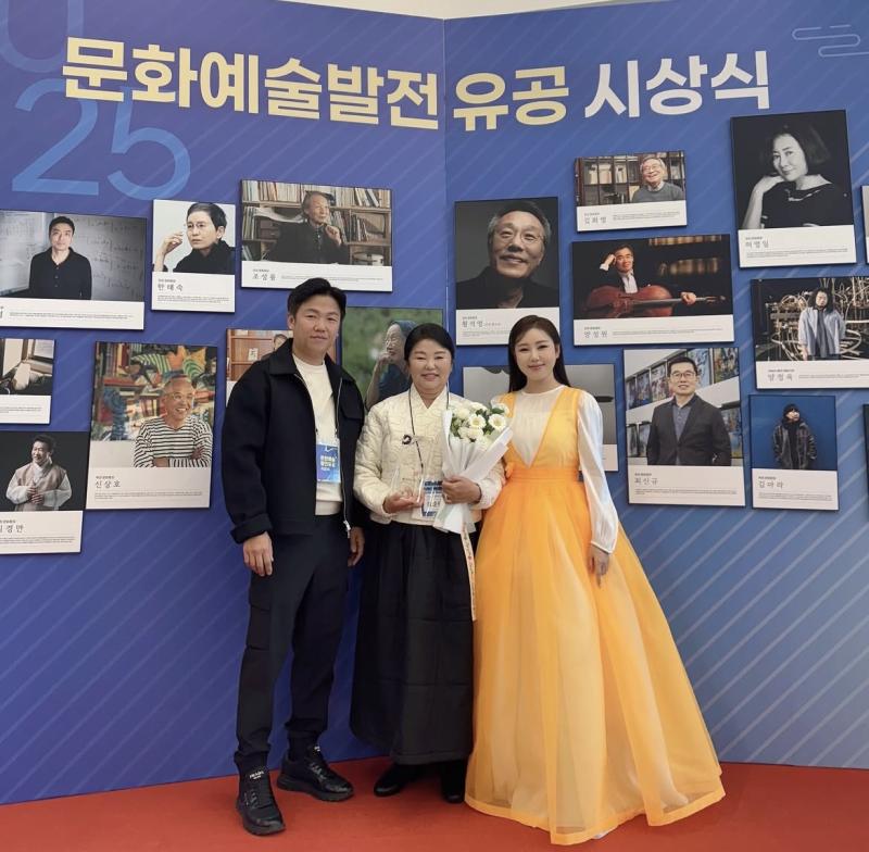 7일 오후 송가인의 SNS에는 “오늘 저희 어머니께서 2025 문화예술발전 유공 시상식 장한 어버이상을 수상하셨습니다!!!”라는 글과 함께 여러 장의 사진이 업로드됐다. 사진에는 송순단 명인과 아쟁 연주자 아들 조성재, 딸 송가인이 환한 미소를 짓고 있으며, 송가인 공식 팬카페 ‘어게인’이 보낸 축하 선물 사진도 공개됐다.