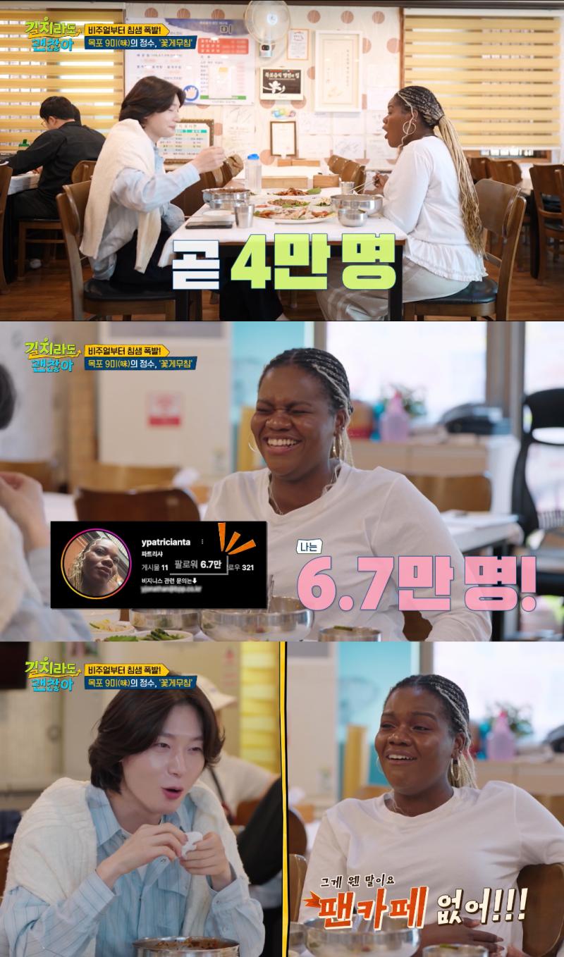순간 당황한 김용빈은 “네가 나중에 확인해봐...내가 말하고 싶지 않네”라며 답변을 회피하려 애썼다. 파트리샤의 거듭되는 질문 압박에 “그냥... 4만 명 다 돼 가”라며 겸연쩍게 실토했다. (방송 시점 이후 팬카페는 4만 명을 돌파했다) 반격의 기회를 잡은 파트리샤는 “내 인스타 팔로워는 6만7천 명 인데”이라며 결정타를 날렸다.