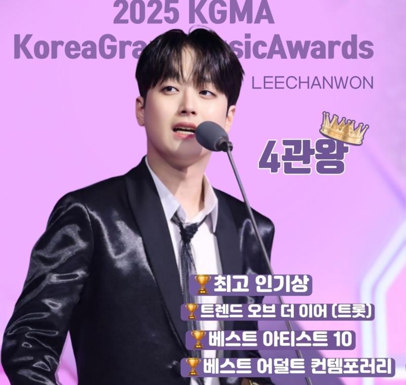 사진=이찬원 공식 팬카페 이찬원이 인천의 인스파이어 아레나에서 지난 14일과 15일 이틀에 걸쳐 열린 '2025 코리아 그랜드 뮤직어워즈 위드 iM 뱅크(KGMA)’에서 4관왕에 오르며 다시 한번 대세 가수임을 입증했다.