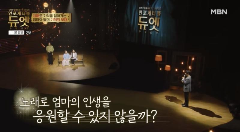 이날 방송에는 배우 이주화와 치매를 않고 있는 87세 노모 이순호씨가 출연했다. 이주화는 연극과 방송 프로그램 ‘부부클리닉 사랑과 전쟁’에서 얼굴을 알리고 현재 연극무대에서 활약하고 있는 32년차 배우. 이주화는 2년 전 치매 진단을 받은 어머니와 함께 ‘언포게터블 듀엣’ 무대에 올랐다.
