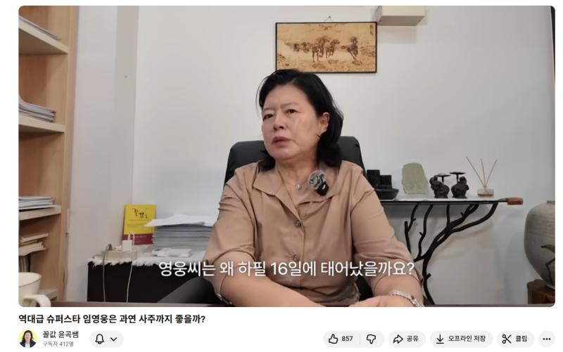 “임영웅 씨가 왜 6월 16일 초여름에 태어났을까요? 더우니까 물이 필요한 겁니다. 그에게 물은 ‘명예’를 뜻합니다. 그러니 명예가 올라가는 것이죠…. 삼성 이재용 회장의 사주를 보면 연(年)의 자리(할아버지)에 큰 땅(土) 밑에 큰 바위(金)가 있고, 월(月)의 자리(아버지)에 큰 땅 밑에 작은 불(火)이 있습니다. 어느 땅이 더 단단하겠습니까? 바위가 받치는 땅입니다. 그래서 할아버지가 ‘부’를 이루고 아버지가 그 ‘부’를 이어받은 겁니다. 자연은 이렇게 거짓말을 하지 않습니다.”