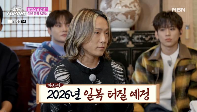 지난 9일 방송된 MBN ‘한일톱텐쇼’ 72회에서는 박서진, 에녹, 신승태, 김준수, 최수호, 유다이, 마사야, 타쿠야, 쥬니, 신 등 한일 멤버들이 한옥 펜션으로 ‘굿바이 2025’ MT를 떠나는 모습이 그려졌다.