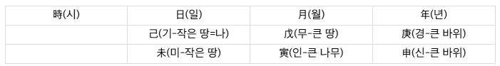 연월일이 모두 갑(甲) 큰 나무이고, 술(戌)은 큰 땅이다. 술(戌)도 불(火)이 암장 되어있는 땅이다.