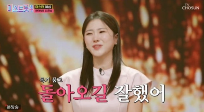 현역부B 최은비는 미스트롯2에서 대학부로 출전해 탈락의 고배를 마신 후 17kg을 감량하고 돌아와 모두를 놀라게 했다. 국악풍의 깊은 저음이 돋보이는 ‘옥수수밭에 당신을 묻고’로 올하트를 받으며 양지은 마스터로부터 “가창력 자체가 매우 높아졌다”는 호평을 끌어냈다.