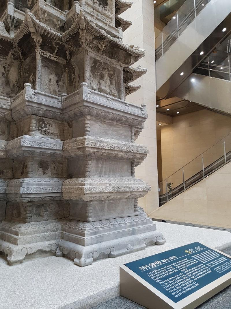 국립중앙박물관 로비에는 웅장한 높이(13.5m)의 ‘경천사지 10층 석탑’이 있다. 고려 충목왕(1348년) 때 지금 북한의 개성에 대리석으로 10층으로 만들었다. 석탑은 대부분 화강암으로 제작되는데 대리석은 색감이 화강암보다 뽀얗고, 강도가 물러 조각 표현이 수월하며, 질감도 더 매끈하다.