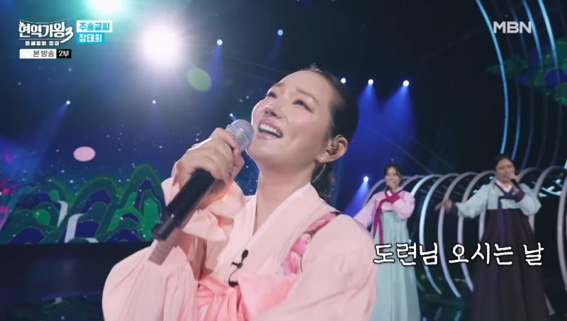 선공 차지연이 기선을 제압하는 압도적인 가창력의 무대를 선보인 직후라 마스터들은 부담감이 있을 거라며 걱정하는 분위기였다. 환한 조명이 켜지고 신나는 전주 음악이 흘러나오고 밝고 흥겨운 무대가 펼쳐졌다.