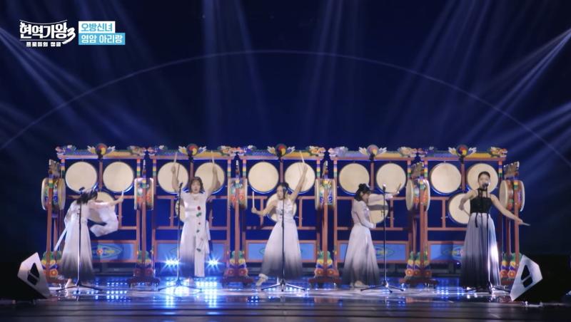 이 팀은 첫 곡으로 '영암 아리랑'를 택해 고난도 오고무를 추며 열창해 기선제압에 나섰다. 강유진, 추다혜, 하이량은 '물레방아 인생'으로 흥을 고조시켰고, 금잔디와 김주이는 '사모'로 가창력을 입증했다, 이어 강유진, 추다혜, 하이량은 '짝짝짝' 무대에 이어 '오방신녀' 팀 전원은 '수리수리술술'에 맞춰 흥댄스로 현장의 호응을 이끌어냈다.