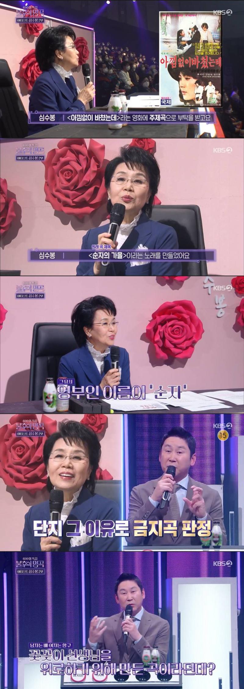 제5공화국 출범 이후 〈순자의 가을〉은 방송 금지 처분을 받는다. 제목에 등장하는 ‘순자’라는 이름이 당시 대통령 부인의 이름과 같다는 이유였다. 정치적 메시지도, 비판도 없었지만, 노래는 금지됐고, 심수봉의 방송 출연 역시 다시 막혔다.
