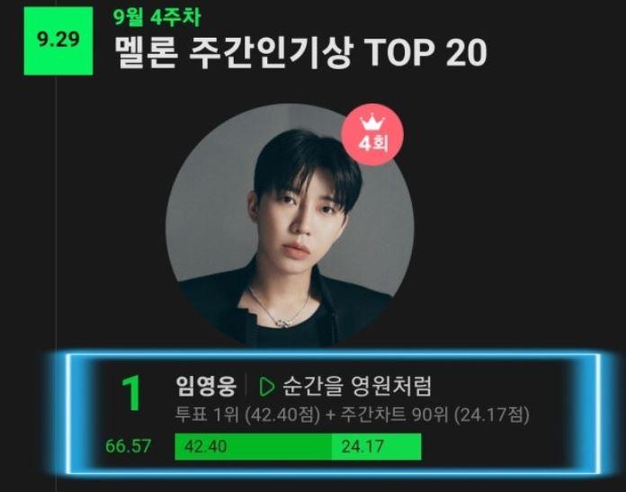 30일 멜론에 따르면 임영웅은 9월 4주차 멜론 주간 인기상에서 신곡 ‘순간을 영원처럼’으로 1위를 차지했다. 총점 66.57점을 기록했으며 이 중 투표 점수는 42.40점 음원 차트 점수는 24.17점이었다. asepa(60.24점)와 PLAVE(58.73점)를 제치고 정상에 올랐다. 이번 수상으로 임영웅은 멜론 주간 인기상 통산 30회 수상을 기록했다.