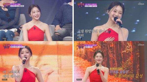 이어 홍지윤은 지난 17일 방송된 ‘트롯 올스타전: 금요일 밤에’에서 레드 드레스로 강렬한 첫인상을 남기며 ‘트롯 선후배의 밤’ 특집 무대를 빛냈다. ‘미스트롯2’ 동료들과 함께한 ‘서울 가 살자’ 무대에서는 완벽한 하모니와 여유 있는 무대 매너로 감탄을 자아냈다. 대결 전에는 “오늘 두 오빠 잡으러 왔다”며 자신감을 드러냈고, 5라운드에서는 김용임의 ‘내장산’을 완벽하게 소화하며 100점을 기록했다.