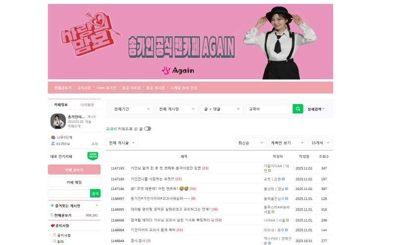송가인 팬카페 ‘어게인’ 자축 글 쇄도…. “해당 교과서 소장하고 싶다.” 요청도