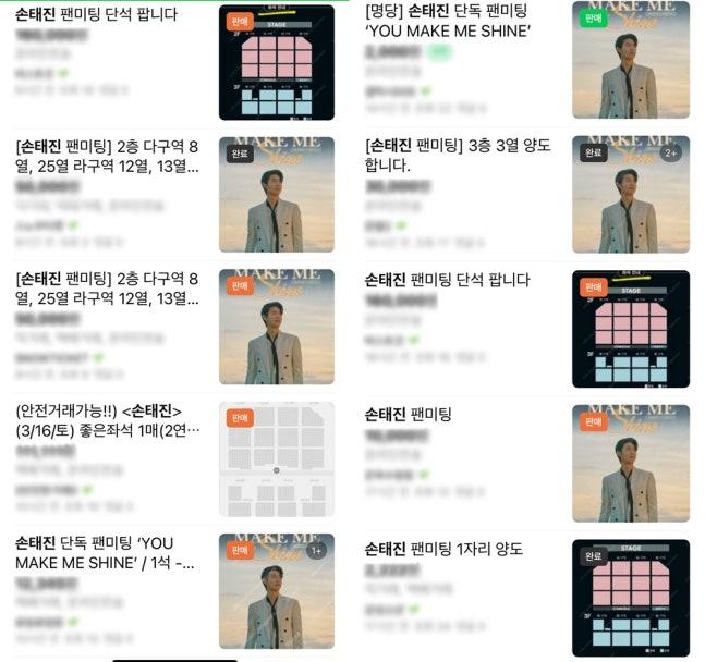 가수 손태진의 첫 단독 팬미팅 ‘YOU MAKE ME SHINE’에서도 암표 거래가 나타났다. 예매는 오픈 2분 만에 전석 매진됐고 일부 팬들은 중고거래 사이트에서 고가로 거래를 시도했다. 공연 제작사는 “기업적 암표 거래 여부를 정밀히 살피고 있다”며 “티켓 예매사와 협의해 적절한 조치를 할 것”이라고 설명했다.