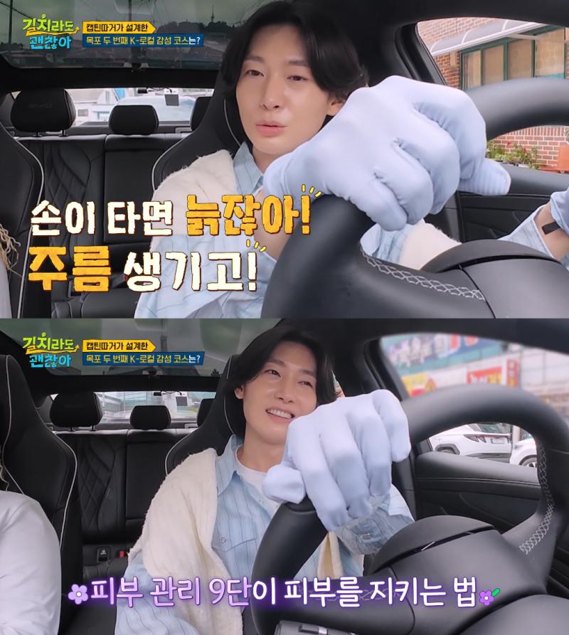 김용빈의 ‘햇볕 철벽 방어’는 여기서 끝이 아니었다. 여행용 전기차를 배정받고 신기해하던 것도 잠시, 운전대에 앉자마자 그는 자연스럽게 장갑을 손에 꼈다.