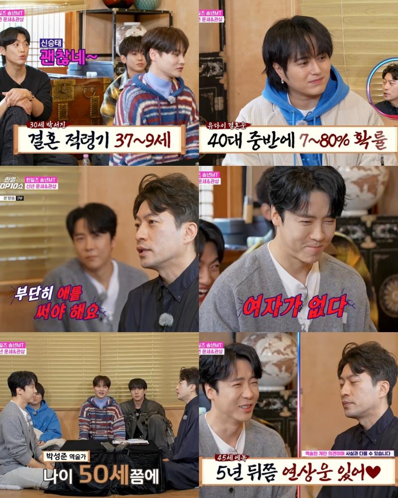 “내년엔 연애할 수 있냐”는 질문에 역술인은 “37~39세는 되어야 결혼할 여자를 만날 수 있다. 잠시 만날 순 있어도 노력에 비해 결과가 미흡하다”며 하지만 재주가 맣은 ‘나무에 매달린 원숭이 상’이라는 진단을 내렸다. 이어 “타쿠야나 신승태가 도움이 된다”는 말에 박서진은 즉시 타쿠야 옆으로 자리를 옮겨 ‘동갑내기 절친’ 유다이를 손절(?)하는 모습으로 웃음을 자아냈다.