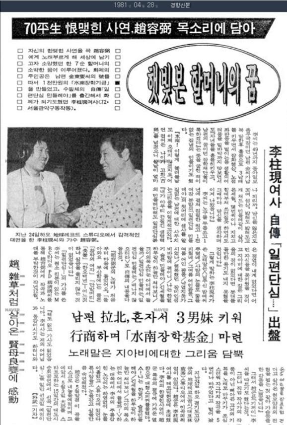 1981년 4월 28일 신문에 실린 기사 ‘햇빛 본 할머니의 꿈’은 ‘이주현’ 여사의 ‘일편단심’ 이야기를 기록하고 있다.