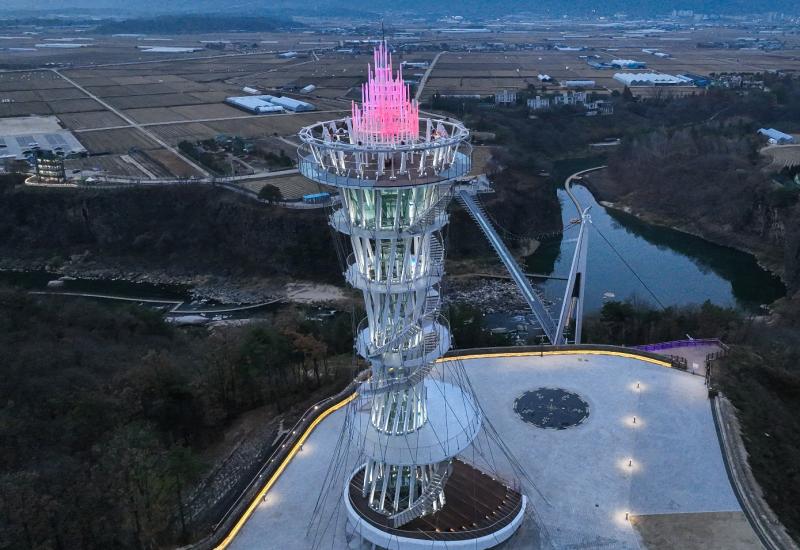 한탄강의 랜드마크이자 철원의 밤하늘을 밝히고 있는 ‘횃불전망대’는 높이 45m, 조형물 포함 전체 53m로 송대소 방향(왼쪽)으로 4.3도 기울어져 있는 비정형 구조로 외부에서 보는 위치에 따라 다르게 보인다.