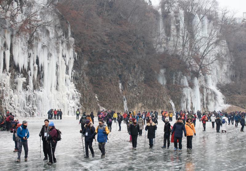 ‘한탄강 물윗길’은 유네스코 세계지질공원으로 등재된 한탄강의 주상절리를 물 위에서 감상할 수 있는 트래킹 코스이다. 물윗길은 이름처럼 물 위를 걷는 산책 코스로 평소에는 접근할 수 없는 수려한 한탄강의 자연경관을 강 위에 설치된 부교를 따라 걸으며 온전히 감상할 수 있는 겨울만의 특별 이벤트다.