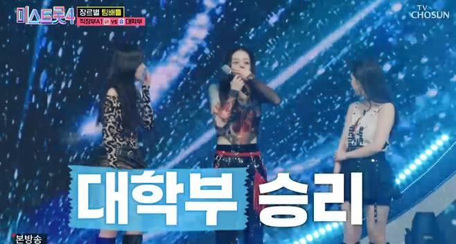 선공에 나선 대학부 (길여원, 유수비, 윤예원)는 ‘날이 날이 갈수록’을 선곡, 생수를 뿌리는 등 대학생다운 패기 넘치는 퍼포먼스를 선보였으나 임팩트를 주지는 못한 무대로 마무리 했다.