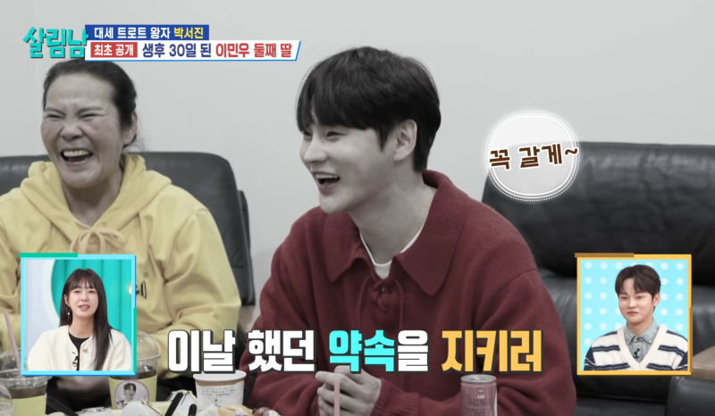 하지만 그가 찾은 곳은 이민우의 집. 박서진은 이민우의 큰딸 리아가 본인의 콘서트장을 찾아 “오빠 우리집에 놀러오세요“라고 말했던 것에 대한 약속을 지키기 위해 이곳을 찾은 것이다. 그는 생후 30일 된 이민우의 딸 양양이의 선물과 큰딸 리아의 선물을 가득 들고 이곳을 찾았다.