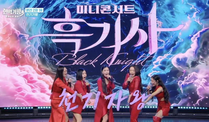 다음으로 리더 스테파니와 차지연, 홍자, 장하온, 장태희가 뭉친 ‘천기가왕’ 팀은 준비 과정에서 몸을 쓰는 데 익숙하지 않은 홍자와 연습에서 실수를 계속한 장태희가 불안감을 자아냈지만 ‘천기가왕’ 5인은 첫 곡 ‘미니스커트’부터 한 편의 뮤지컬 같은 퍼포먼스로 대중을 사로잡았다. 이어 홍자, 장태희, 장하온은 ‘바보’로 구성진 음색과 댄스 퍼포먼스의 조화를 선보였고, 차지연은 ‘갈무리’로 절절하면서도 파워풀한 보컬을 자랑했고 ‘개여울’에서는 스테파니의 환상적인 발레 퍼포먼스와 홍자의 곰탕 보이스가 어우러져 깊은 울림을줬다.