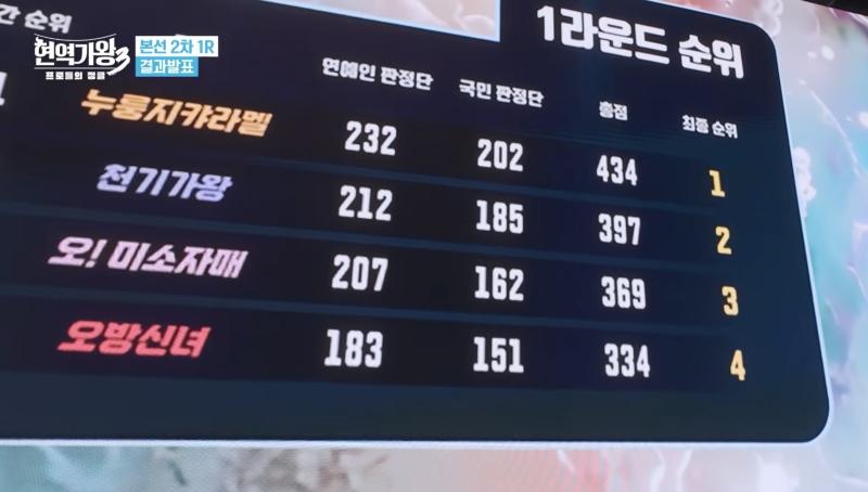 본선 2차전 1라운드 팀 미션이 끝난 후 공개되지 않았던 260점이 걸린 국민 판정단 점수가공개됐고 434점을 획득한 '누룽지캬라멜'이 압도적인 점수로 1위를 지켜냈다. 2위는 397점을 받은 '천기가왕', 3위는 369점의 '오! 미소자매', 4위는 334점의 '오방신녀'가 차지했다. 다음 주 팀전 2라운드 ‘에이스전’이 남아있는 가운데 과연 팀 순위에 어떤 변동이 있을지 초미의 관심이 쏠린다.