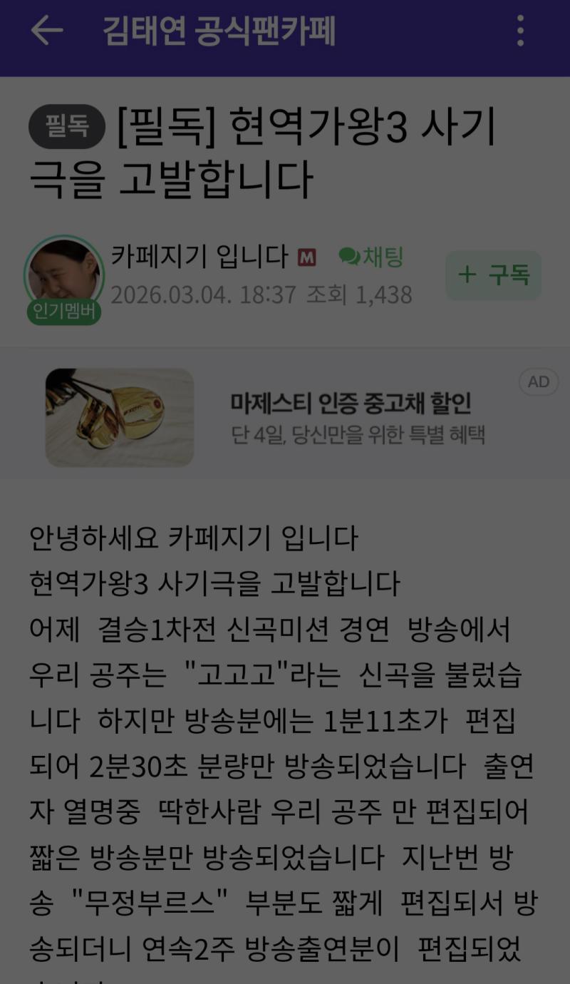 김태연의 팬 카페 ‘태연천하’는 지난 4일, 카페지기 명의로 ‘현역가왕3 사기극을 고발합니다.’라는 파격적인 제목의 긴급 공지를 올렸다.