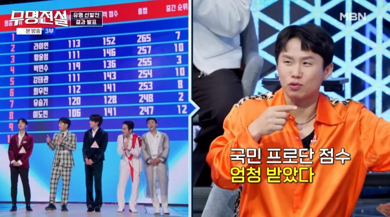 ‘무명전설’이 유명선발전에 도입한 점수 배점은 국민프로단(방청객) 170점, 탑프로단(전문 심사위원) 130점, 총 300점이다. 전문 심사위원보다 방청객 점수가 더 높은 비율(56.7%)을 차지하는 구조다. 더 놀라운 점은 이것이 준결승도, 결승도 아닌 ‘예선’이라는 사실이다.