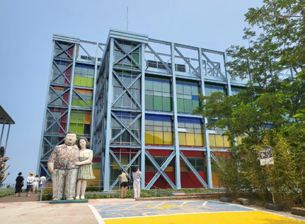 박물관을 나서면 바다 카페 뒤편으로 이어지는 조각공원 역시 다양한 미술작품과 포토존이 어우러져 관람객을 맞이한다. 특히 최옥영 작가의 작품들이 곳곳에 설치되어 있는데, 그중에서도 <머릿속으로>를 통해 거대한 머릿속으로 들어가는 듯한 형태는 현실과 상상의 경계를 넘나드는 독특한 체험을 선사한다.