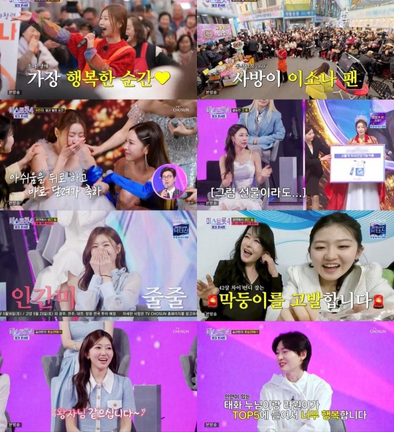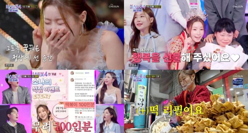 이날 가장 먼저 포착된 건 '미스트롯4' 결승전 발표 당일, 진(眞) 이소나였다. 중간발표에서 선(善) 허찬미에게 단 1점 차로 뒤져 있던 상황에서, 실시간 문자 투표를 통해 극적인 역전에 성공한 이소나는 최종 우승이 확정되자마자 그 자리에 주저앉아 눈물을 쏟아냈다. 장윤정은 이를 지난 경연에서 가장 기억에 남는 순간으로 꼽으며 "우리가 소나 씨를 'AI' 같다고 했는데, 그런 그녀의 눈에서 폭포수 같은 눈물이 흐르던 게 인상 깊었다"라고 전했다.