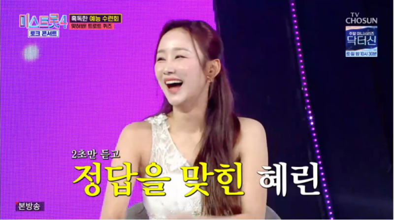 미스트롯4 출전했던 가수 정혜린이 '토크콘서트'에서 예능감을 발휘해 웃음을 선사했다/사진=TV조선