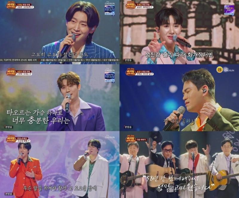 김용빈,손빈아, 천록담이 쎄시봉 명곡을 재해석해 헌정무대를 선보였다(사진=TV조선 '금타는 금요일')