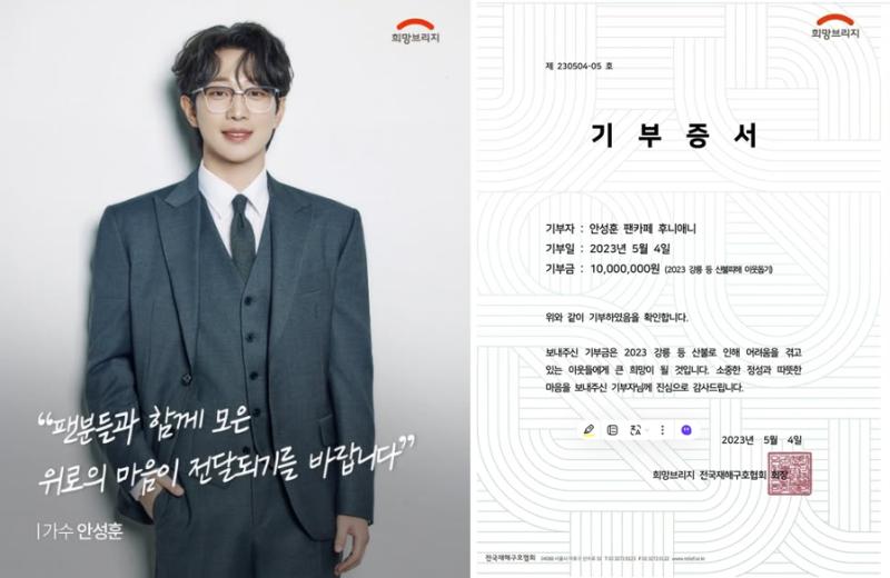 안성훈은 팬클럽 ‘후니애니’와 함께 산불 피해 주민들을 위해 희망브리지 전국재해구호협회에 성금 1,000만 원을 기부했다. 이번 기부는 안성훈과 팬들이 매월 함께 진행하고 있는 ‘만원의 행복 통장 캠페인’을 통해 사전에 모금된 금액으로 이루어졌다.
