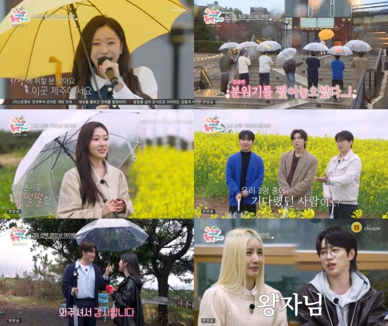 푸른 바다의 낭만이 가득한 제주도를 배경으로 미스&미스터 트롯 주역들의 두근두근 듀엣찾기 여행이 시작됐다. TV CHOSUN의 신규 예능 ‘우리 듀엣할까요?’가 지난 23일 첫 방송의 막을 올렸다. 우승 상금 500만 원이 걸린 ‘듀엣 가요제’. 이를 향한 14인 남녀 출연진의 양보 없는 짝꿍 쟁탈전은 첫 회부터 시청자들의 눈과 귀를 사로잡기에 충분했다.